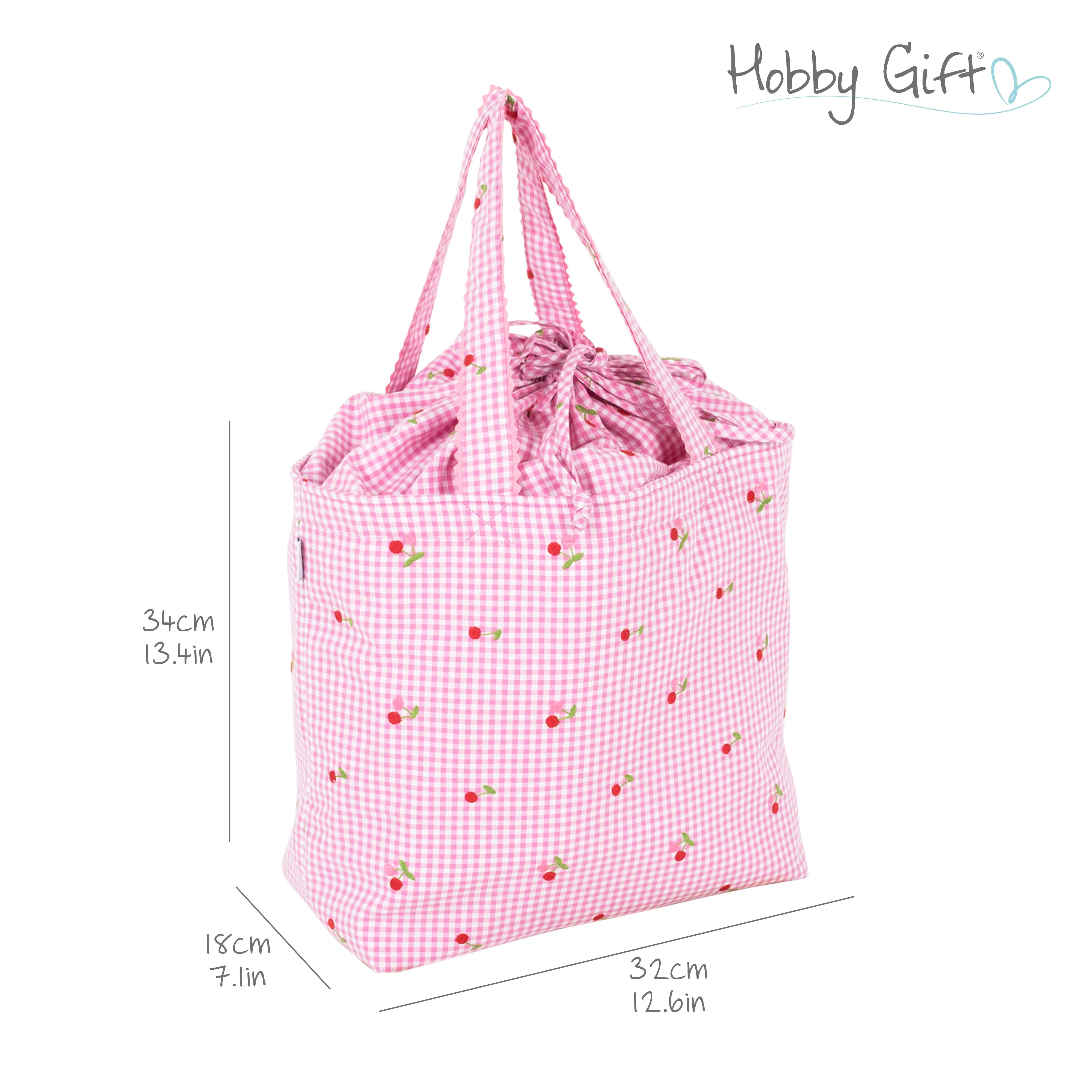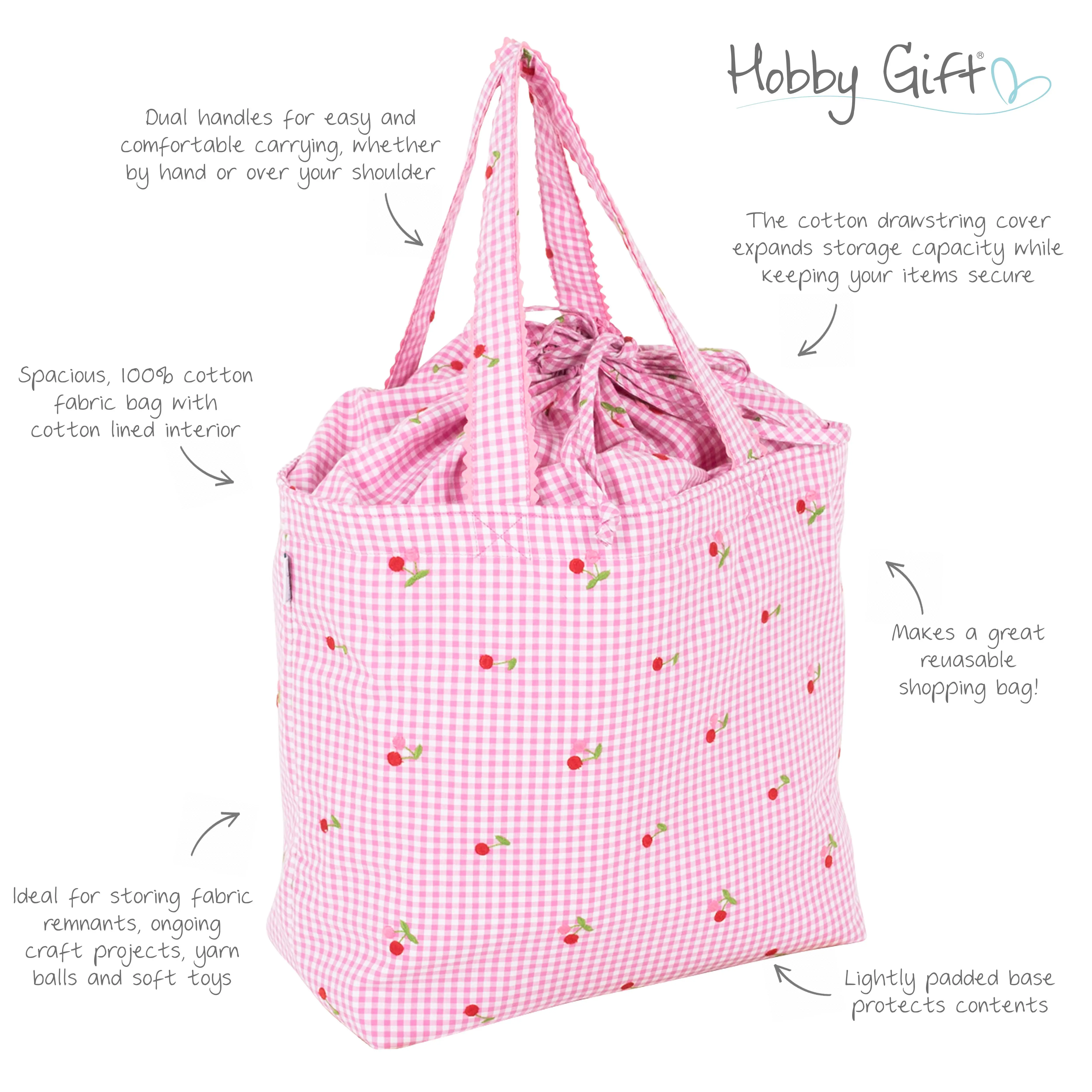 Keep your craft projects and beautifully organised with this charming large drawstring craft bag. Designed in a classic cotton gingham fabric with a delicate embroidered cherry motif, this bag combines practical storage with a fresh, timeless style.