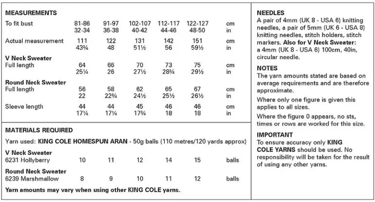 You will need – Pair of 4mm and 5mm knitting needles. Also for the v-neck jumper a 4mm 100cm circular knitting needle