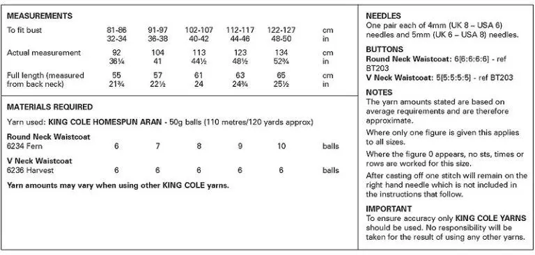 You will need – Pair of 4mm and 5mm knitting needles. 5 button for the v-neck waistcoat. 6 buttons for the round neck waistcoat