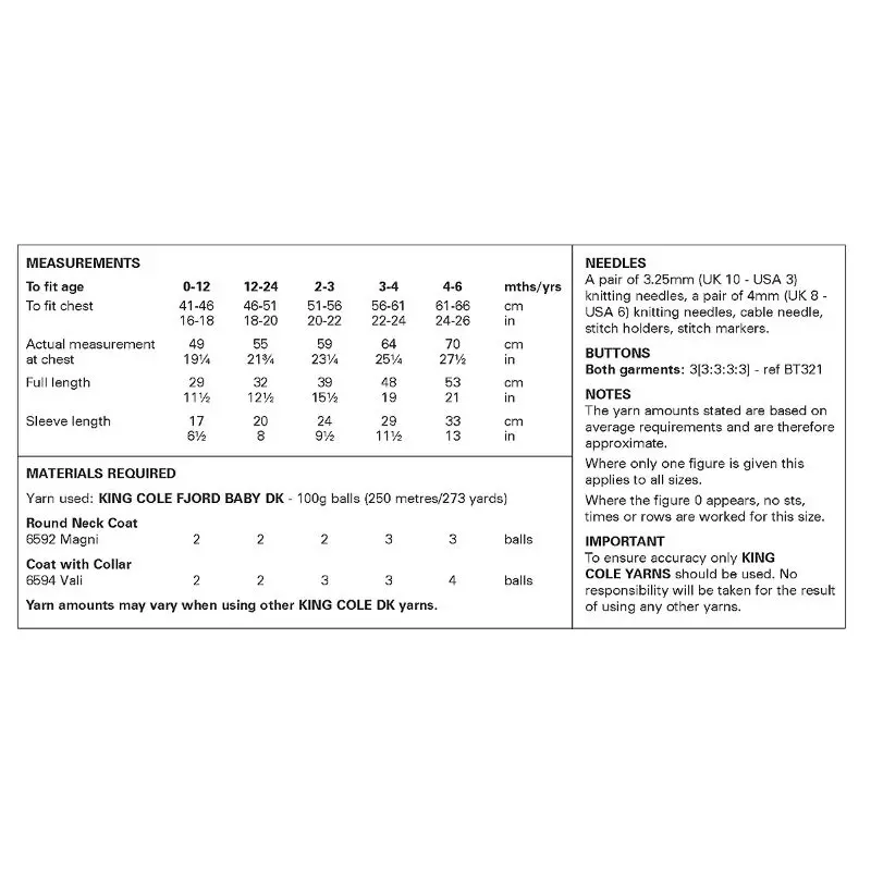 The King Cole 6464 Baby DK Coats Knitting Pattern is a baby and children’s knitting leaflet designed to create cosy outer-wear garments. Specifically, this pattern includes a classic round-neck coat and a collared coat, knitted in baby-friendly DK weight yarn. Ideal for keeping little ones warm in cooler weather.