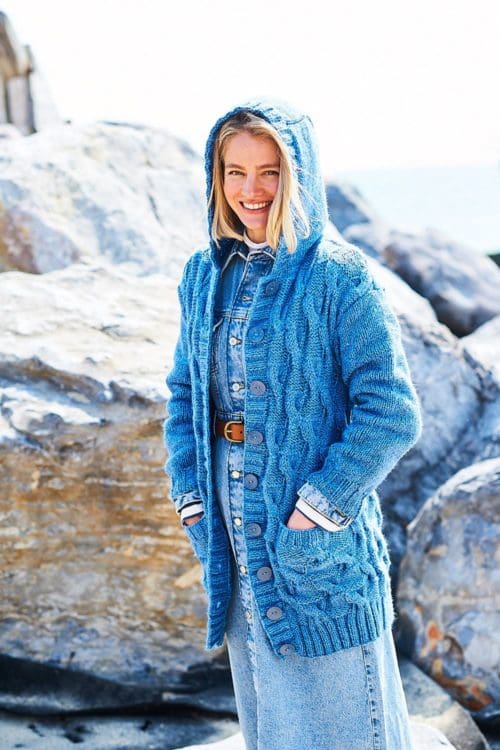 Create a classic cardigan with a unique cable design. The yarn’s dappled effect beautifully highlights the textured pattern. This design will appeal to experienced knitters looking for a stylish project.